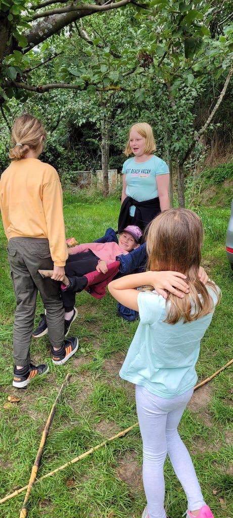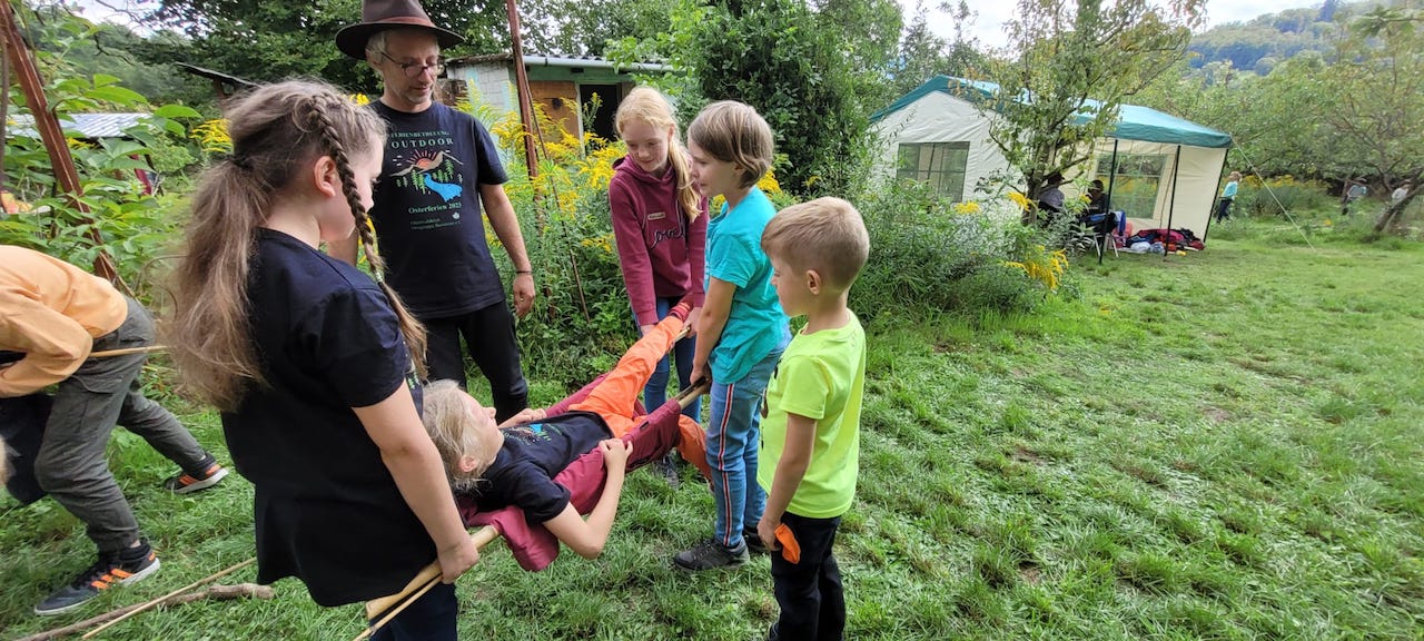 Ferienbetreuung Outdoor Barfußpfad, Schatzsuche und Tipi bauen: Es war eine Menge los bei der Ferienbetreuung Outdoor des Odenwaldklubs Bensheim e.V. in der letzten Sommerferienwoche. Von Mittwoch bis Freitag kamen 26 Kinder im Grundschulalter aus Bensheim und Umgebung und verbrachten die Tage, unter der Leitung der beiden Naturpädagogen Daniel Brendle und Rebecca Goga, draußen im Freien. Mit einem Räucherritual und einer Indianergeschichte fingen die Outdoortage am „Lagerfeuer ohne Feuer“ gemütlich an. Der Mittwoch stand ganz unter dem Motto Ankommen und Achtsamkeit. Auf einem kleinen Waldspaziergang wurde spielerisch der Wald erkundet und ein kurzes Ritual mit Atem- und Bewegungstechniken einstudiert. Mit einigen Barfußübungen wurden Koordination und Geschicklichkeit trainiert und der Barfußpfad neugierig ausprobiert. Mithilfe von Bällen massierten sich die Kinder, unter Anleitung, Reflexzonen an den Fußsohlen. Am Donnerstag stand die mit Spannung erwartete Schatzsuche auf dem Programm. In vier Gruppen aufgeteilt folgten die Kids Pfeilen und Wegmarkierungen, mussten Zahlenschlösser öffnen und Rätsel lösen. Am Ende ergaben die vier ergatterten Teile die endgültige Schatzkarte und die Schatzkiste mit einem kleinen Snack und funkelnden blauen Steinen war schnell gefunden. Nach dem Mittagessen wurden neben freiem Spiel weitere Projekte angeboten, wie die Hütte bemalen, oder eine Trage für Verletzte bauen. Ganz vom Regen wurde die Outdoorbetreuung nicht verschont. Am letzten Tag um die Mittagszeit schüttete es, ganz passend zu den geplanten Wasserexperimenten. „Es hielt sich zum Glück aber in Grenzen. Den Kindern hat das sowieso kaum was ausgemacht“, lacht Organisator Daniel Brendle und bedankt sich sowohl bei den Betreuerinnen Elfi Klinger und Silke Alderete, als auch bei der Vorsitzenden Brigitte Bach mit Team, die sich um das Mittagessen gekümmert haben. „Es waren wieder rundum gelungene Outdoortage, und die Kinder hatten neben unserem Programm noch genügend Gelegenheit, sich in der Natur frei zu bewegen, zu spielen und zu bauen“.