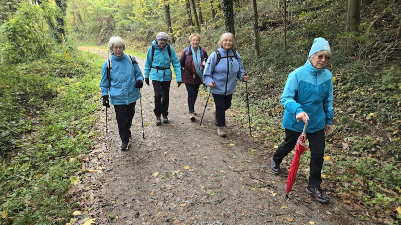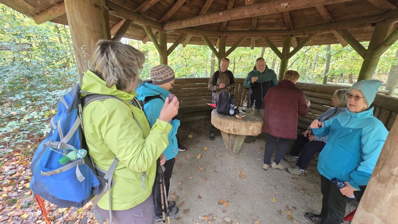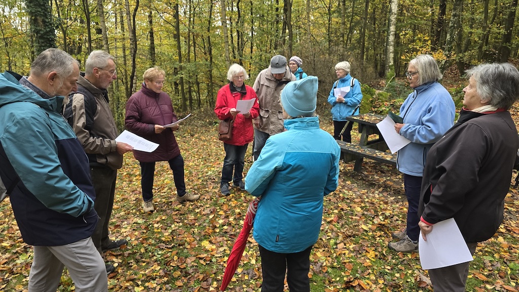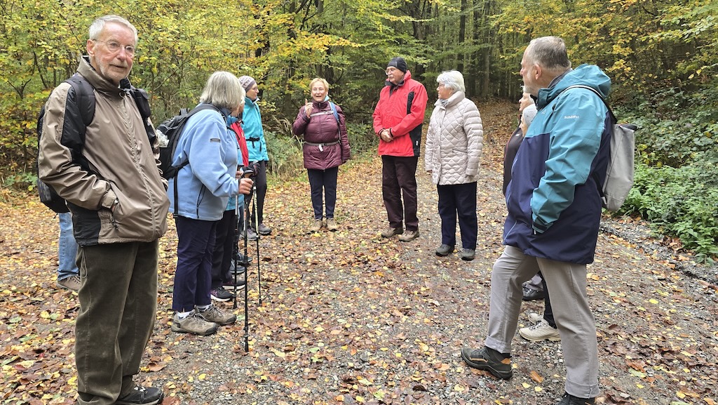Herbstwanderung des OWK Bensheim An einem sonnigen Novembertag machten sich OWK-Mitglieder und Gäste auf den Weg von Wilmshausen, über Gronau, nach Bensheim. Man folgte zuerst dem Kirchenpfad, um dann über den El 2 “ Im Buschern“ auf den Höhenweg, auf dem man sowohl in Richtung Kuralpe, wie auch nach Bensheim gehen kann. Nach kurzer Zeit und schönen Weitblicken kam man wieder auf den Kirchenpfad, folgte ihm in das Tal nach Gronau (früher war das die Abkürzung für die Wilmshäuser auf dem Weg zur Kirche nach Gronau), wo man Mittagsrast im Scholzenhof hielt. Nach der Pause ging es dann über den B 4 zum Parkplatz Bordmühle, und von dort, über Umwegen, nach Bensheim. Brigitte Bach dankte am Ende den beiden Wanderführerinnen Kirsten Schumacher und Erna Jarz für diese schöne Tour.