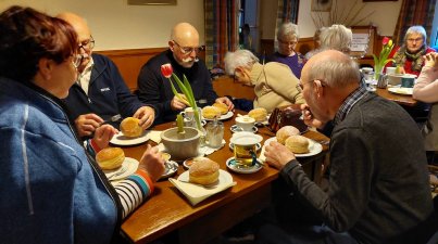 Wanderung mit Kräppelkaffee in der Vettersmühle OWK Bensheim e.V. hatte, wie alljährlich, zur Wanderung eingeladen! 35 Teilnehmer hatten sich daraufhin angemeldet, obwohl die Wettervorhersage Regen ankündigte. Angeboten wurde, wie bei sehr vielen Wanderungen, auch eine Kurztour. Den gesamten Wanderweg regnete es keinen Tropfen! Gemeinsames Ziel war die Vettersmühle in Zell. Dort erwartete man uns bereits mit frischgebackenen, riesengroßen Kräppeln. Nach diesem gemütlichen Beisammensein, traten wir den Rückweg an, wobei uns auffiel, daß die Straßen nass waren. Es hat demnach, nur während unseres Aufenthalts in der Vettersmühle, geregnet. Das nennt man "Glück"! Es war ein schöner Nachmittag, darüber waren wir uns einig und Peter Junker bedankte sich bei den Wanderführerinnen.